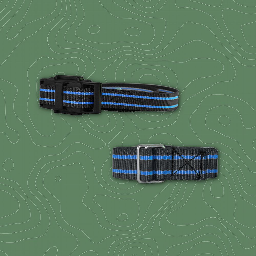 Halsband i kraftig syntettextil med metallspänne, som man trär positionerings-taggen på. Halsbandet är 130 cm i omkrets som störst och går att korta av om det behövs.